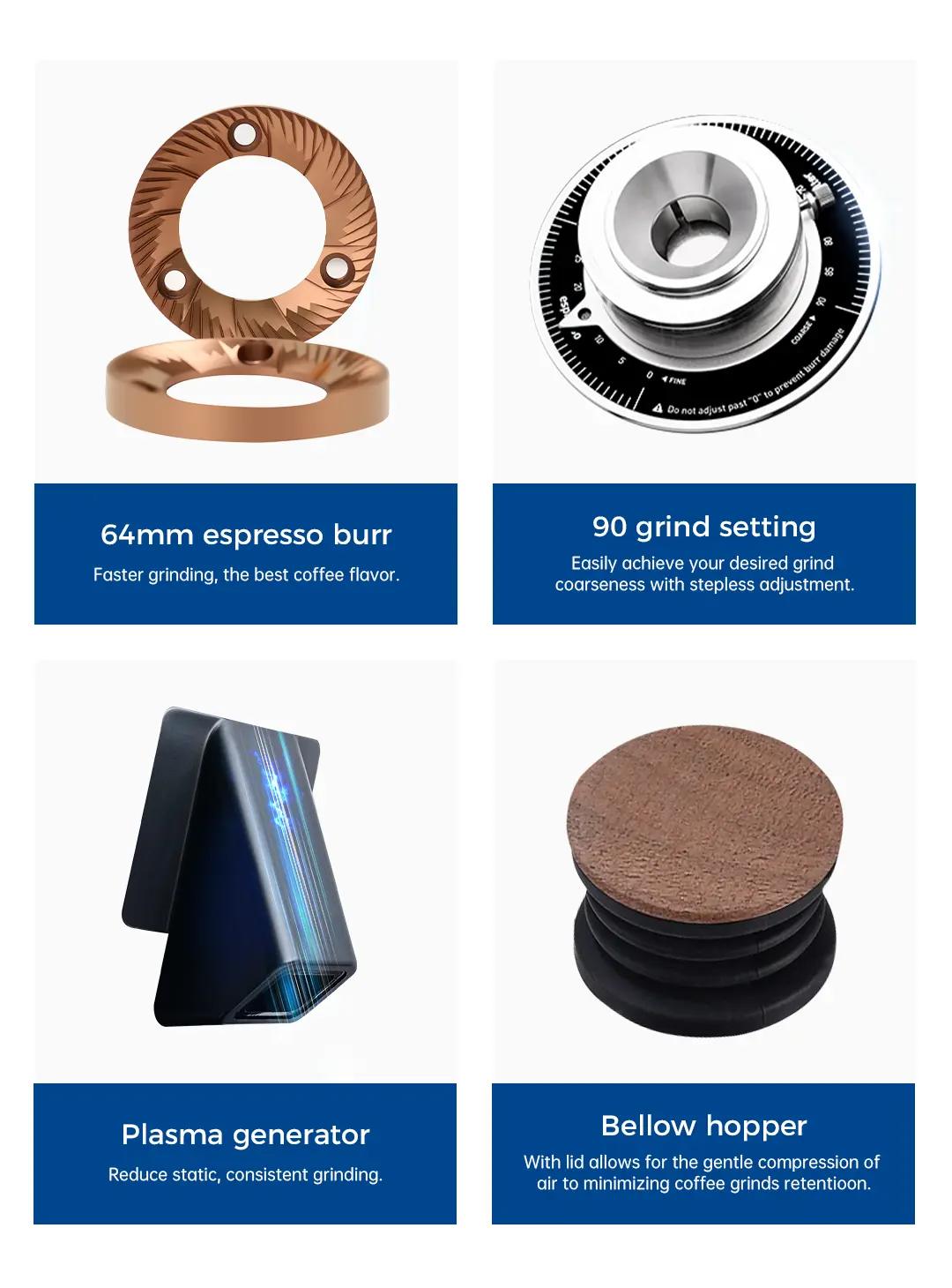 - 64 мм плоски ножове – бързо и консистентно смилане.